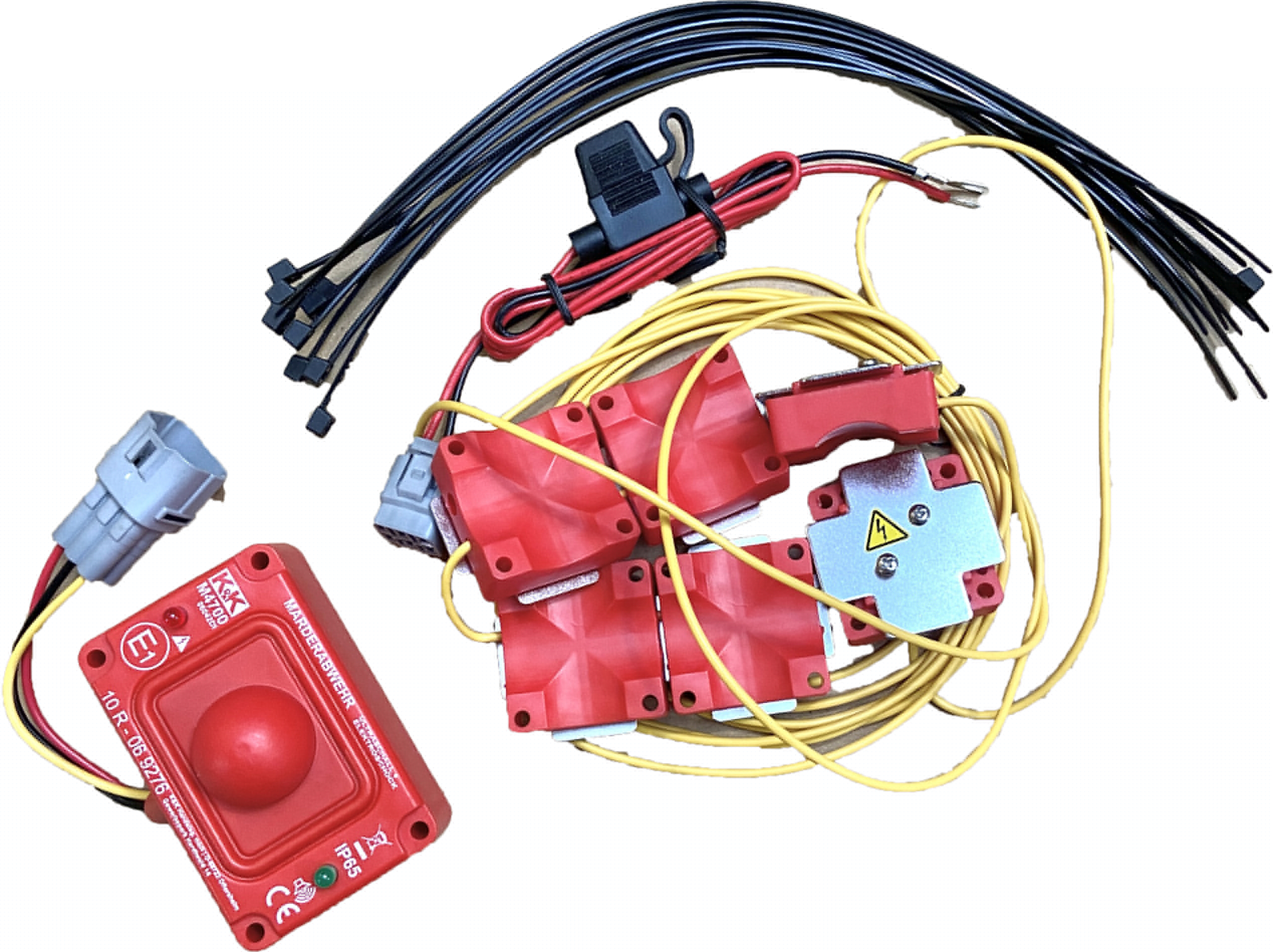 Urządzenie emituje agresywne ultradźwięki w połączeniuz opcją rażenia prądem. Zestaw zawiera 6 płytek stykowych wysokiegonapięcia wykonanych ze stali nierdzewnej, które można elastyczniezamontować wokół komory silnika. Pobór prądu maks. 7 mA, emitujepulsujące ultradźwięki bez efektu przyzwyczajenia, ciśnienie akustyczne115 dB przy częstotliwości 22,5 kHz, kąt promieniowania 360,w 100 %wodoodporna obudowa głośnika, komponenty spełniają normę ochrony IP65.Uwaga: wstrząsy elektryczne są na tyle słabe, aby wyłącznie odstraszyćzwierzęta. Nie wyrządzają im większej krzywdy!